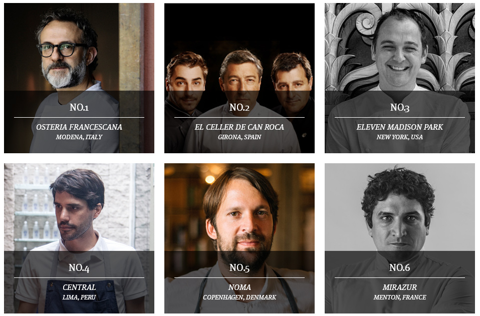 La lista está encabezada por Osteria Francescana, del italiano Massimo Bottura en Módena, que destrona al español El Celler de Can Roca, desplazado al segundo lugar. Se completan los primeros 10 lugares la siguiente manera: